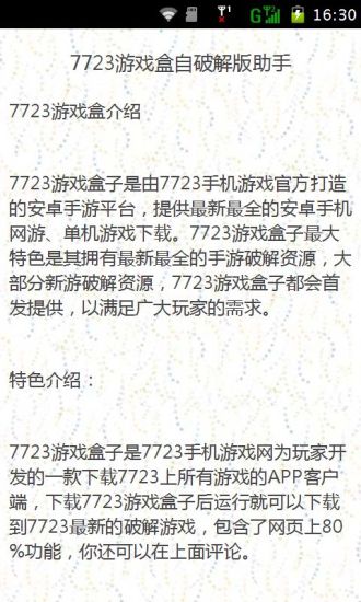 7723游戏盒子是一款集合了手机热门破解游戏的辅助工具,每天更新大量游戏。软件还拥有简洁的排行榜、大量的用户评论,都能为用户带来更好的游戏建议,能够寻找到优质手游,欢迎下载体验