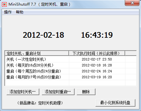 MiniShutoff是一款体积小巧、简单易用的定时关机工具,操作简单,用户只需要设置好日期和时间,软件会自动运行关机或重启功能,方便快捷,界面简洁,一目了然,支持开启后自动启动,欢迎下载使用。