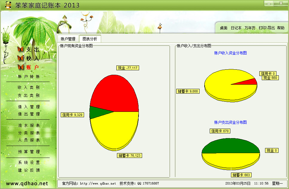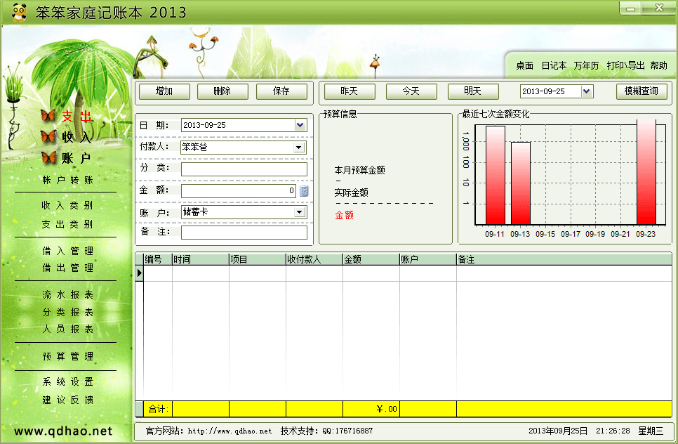 笨笨家庭记账本是一款用于家庭理财、记账的实用型软件。丰富的统计分析功能,让你对自己的开支了如指掌,图形化界面操作更简单,非常容易上手,纯绿色软件,可放在U盘随身携带!