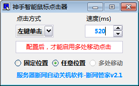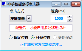 神手智能鼠标点击器是一款非常智能的鼠标点击器,用户利用该软件可以在随意位置或者固定位置快速的进行循环点击,用户可以选择点击方式,设置点击速度,使用方便,真正做到了简单、智能、高效!