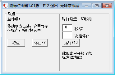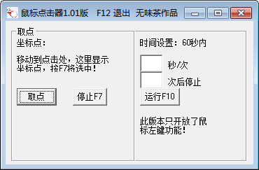 简单鼠标点击器是一款非常简单的鼠标点击器,只开放了鼠标左键功能,用户将鼠标在屏幕上移动即可自动取点,按停止(F7)即可将所取的点选中,用户可以设置运行时间与次数,简单好用!