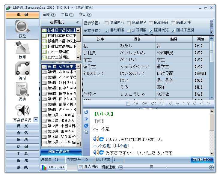 日语丸是一款专门用于学习日语的自学辅助软件,集听、说、读、写、译、背、默、查、析、活、玩等诸多功能及多项独家首创功能 于一体,融入“疯狂英语”的训练精髓及潜能记忆方法,用于日语单词(教材同步单词、JLPT能力考试单词等)、动词活用、教材 同步课文及会话、语法等综合学习于一体的日语自学教辅软件。