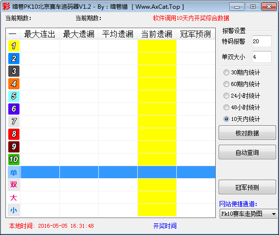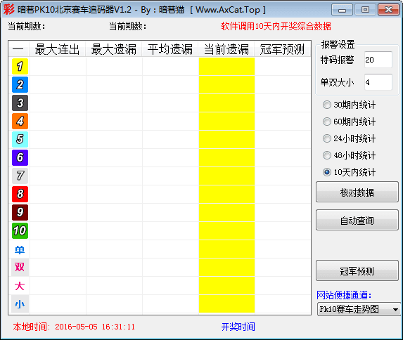 暗巷PK10北京赛车追码器是一款专为北京赛车PK10制作而研发的一款彩票计划辅助工具,该软件能够快速的自动更新奖号,能够自由设置计划期数和码数,是学习北京赛车PK10冠军玩法的必备工具!
