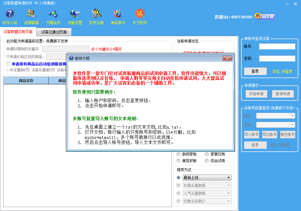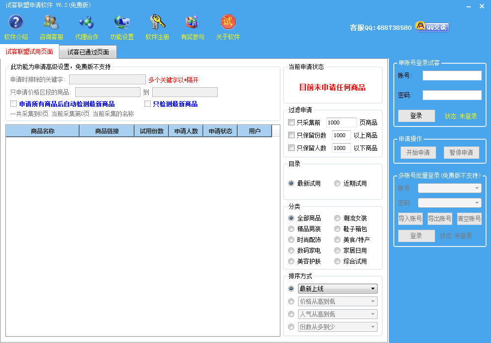 试客联盟自动申请软件是一款非常好用的试用品申请工具,该软件主要用于试客联盟产品的试用试用申请,选择试用内容,软件即可自动帮你申请,成功率非常高,而且完全免费!