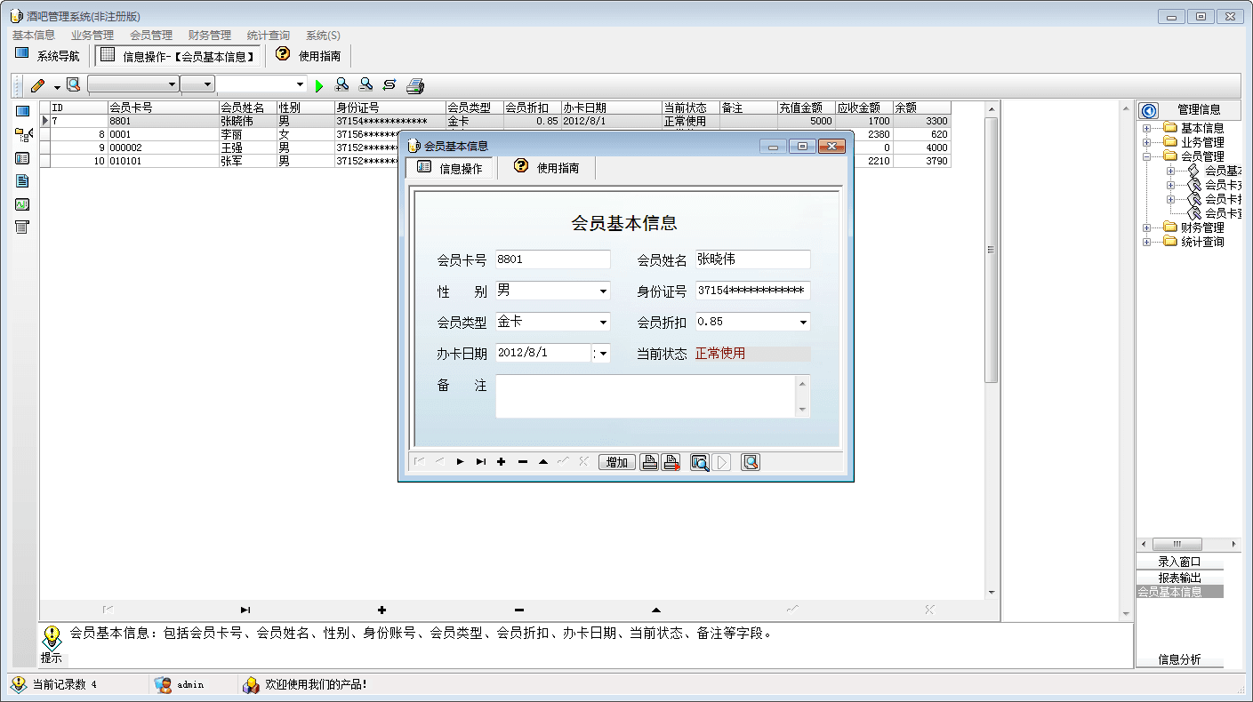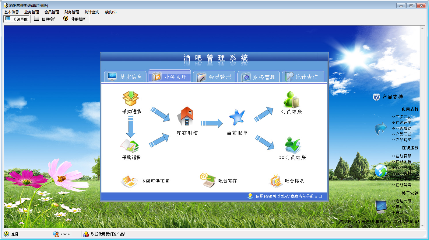 宏达酒吧管理系统是一款优秀的信息管理软件,特别适用于酒吧企业的信息管理,可以进行基本信息管理、业务管理、会员管理、财务管理、统计查询,功能全面,界面友好易于操作。