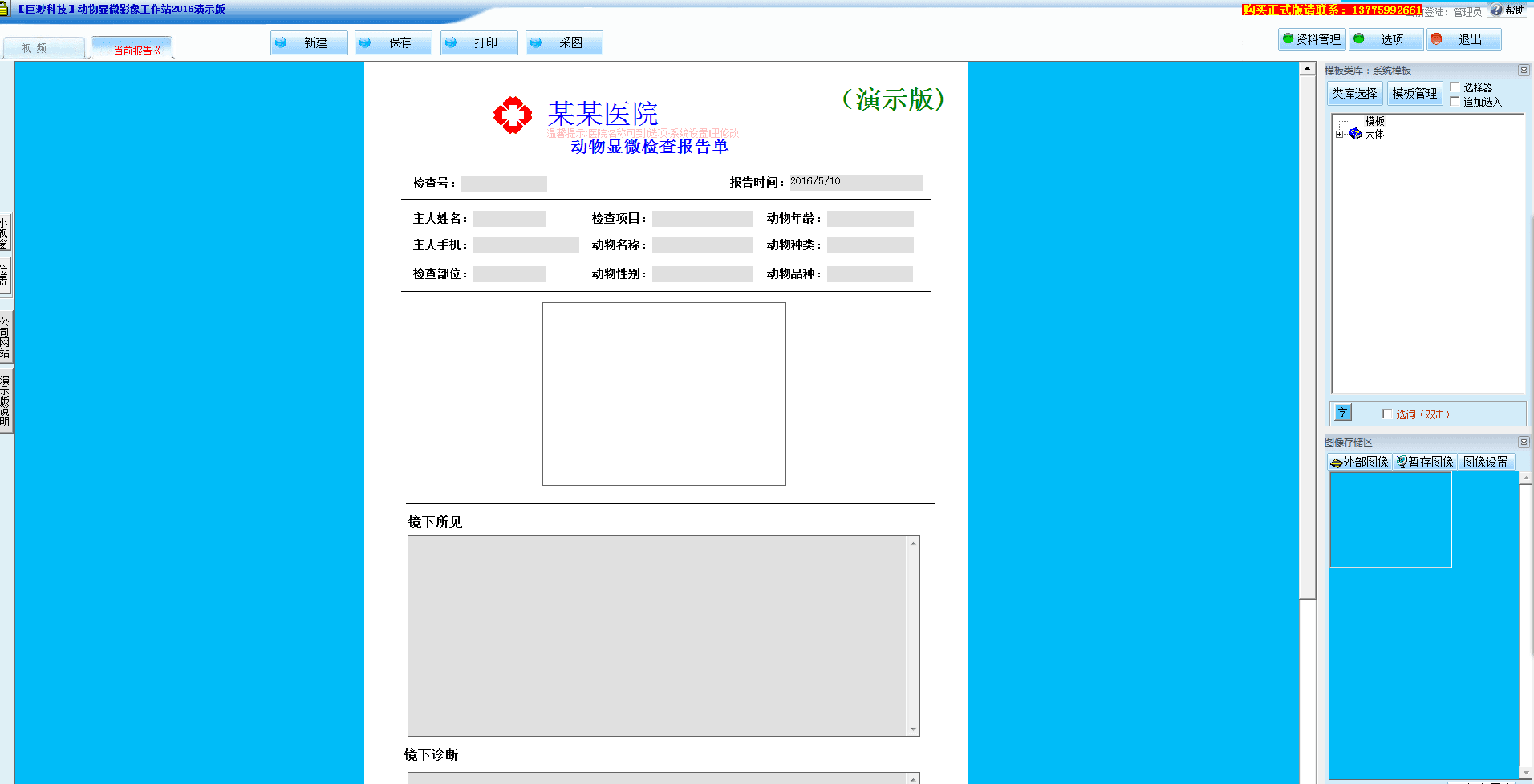 动物显微影像工作站是一款优秀的连接兽用显微检测设备的影像软件,该软件支持各类操作系统,各类视频接口,各类纸张打印尺寸,可以显示图像、采集图像,管理各类图像信息,操作简单,非常容易上手!