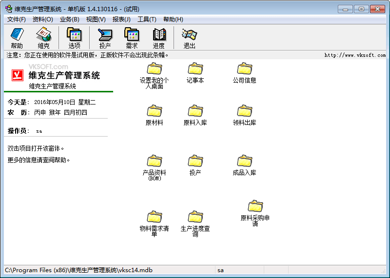 维克生产管理系统是一款优秀的生产管理软件,该软件功能强大,拥有包括系统管理、生产资料管理、投产计划、生产领料、原料入库、成品入库等多项功能,大大提高工作人员的工作效率!
