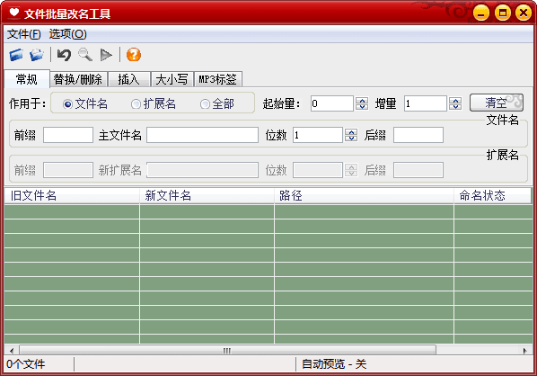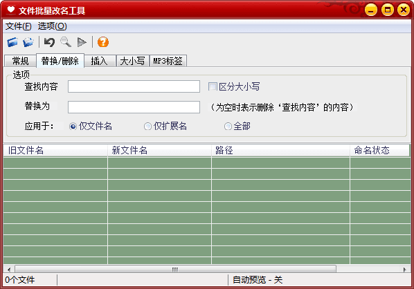 文件批量改名工具是一款多功能的文件更名工具,该软件不仅能够进行常规改名,还能够进行文件内容的替换删除、字符插入、大小写操作,还具备MP3标签功能。