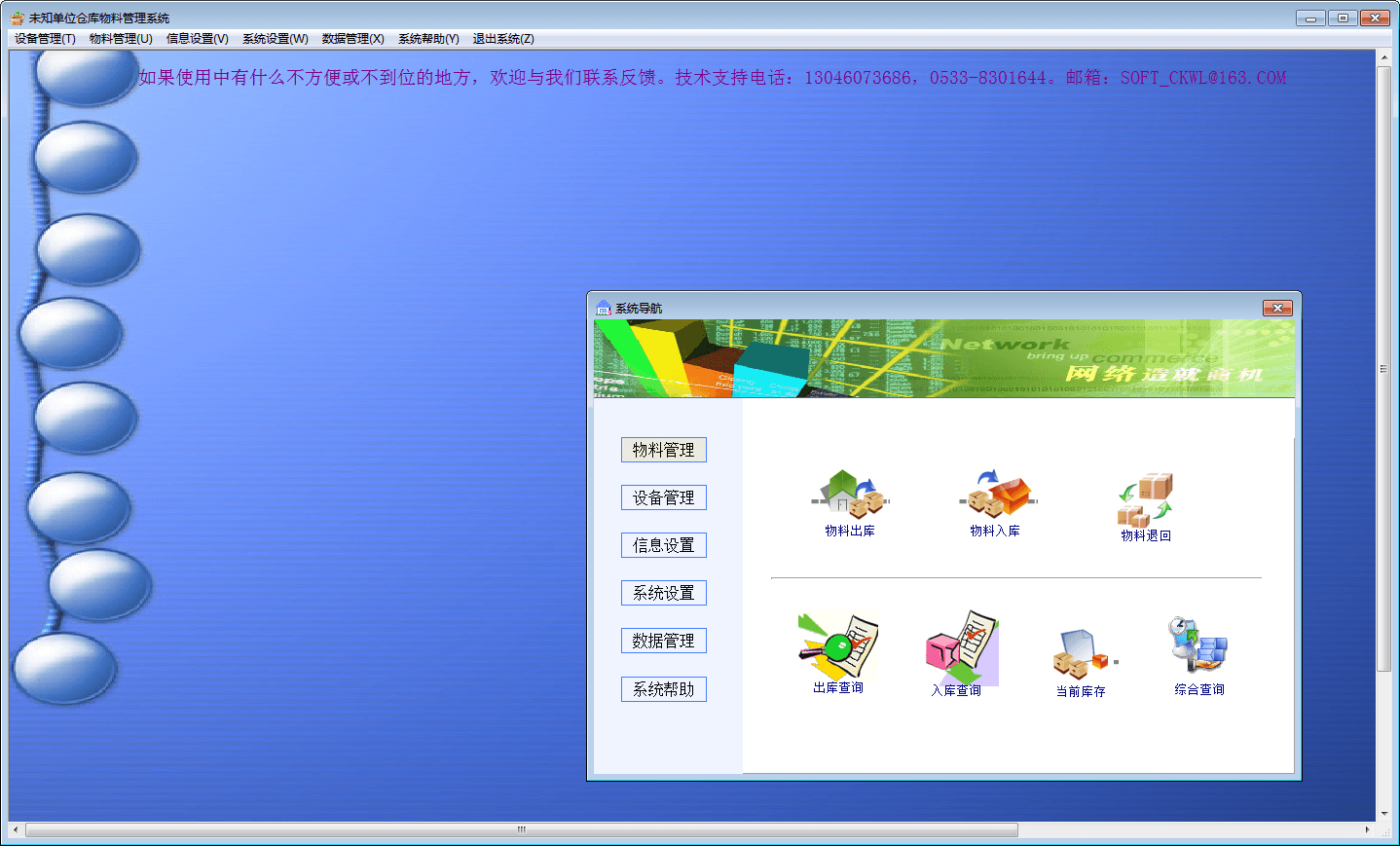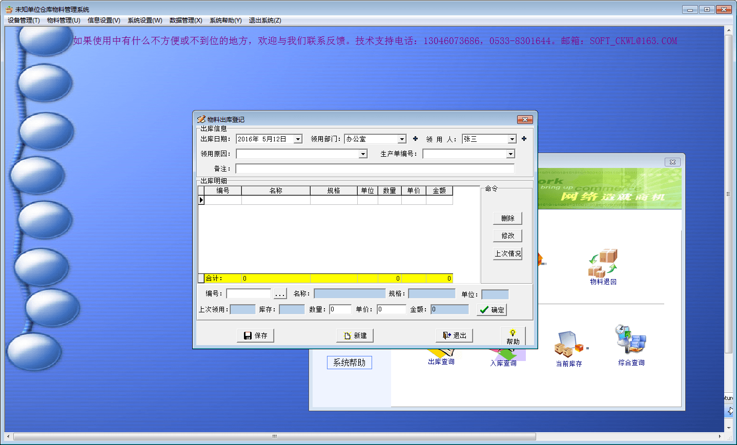 仓库物料管理系统是一款功能多样的管理系统软件,该软件能够实现物料出库、物料入库、物料退回、出库查询、入库查询、当前库存、综合查询等多项功能,而且操作简单,易于使用!