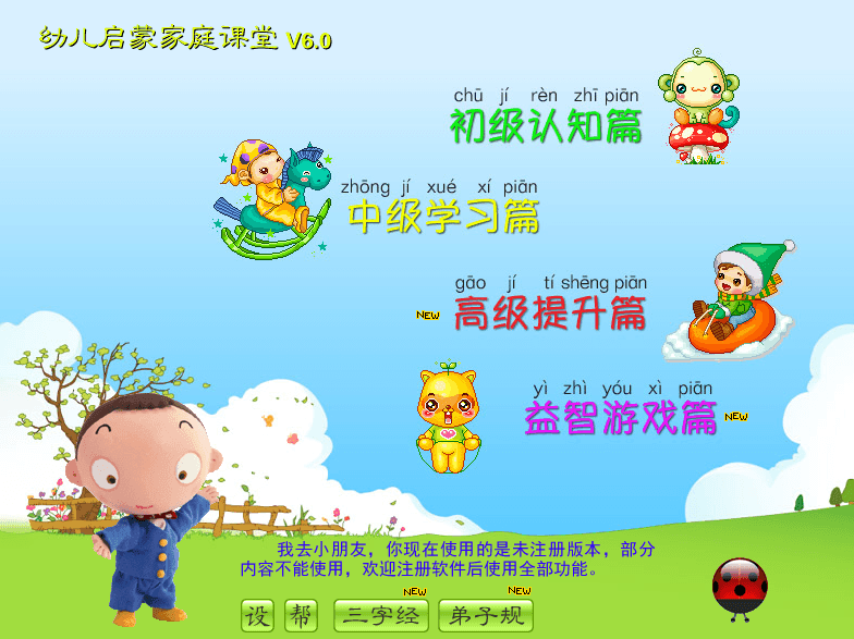 幼儿启蒙家庭课堂是一款专门对2至8岁幼儿进行启蒙教育的多媒体软件,适合于学龄前、幼小衔接阶段以及小学低年级儿童使用。通过大量的图片、文字、声音、动画等多媒体素材对幼儿进行启蒙教育。