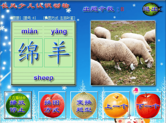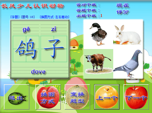 长风少儿认识动物软件采用精美的版面和水果按纽以及图文声三位一体的方式,软件内置多种图片切换特效,以及题型和类型的变换,以更多的满足了孩子的求新求异欲。