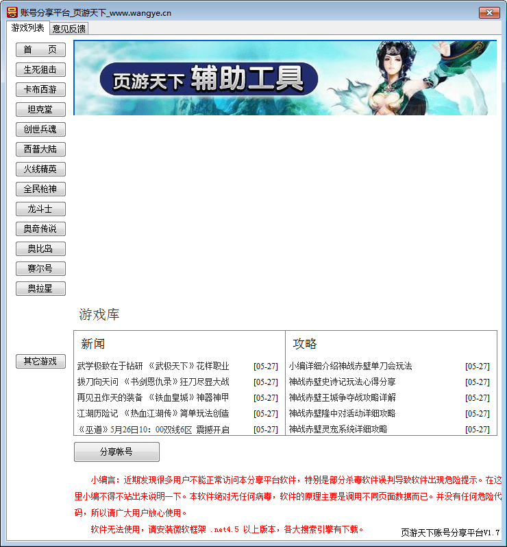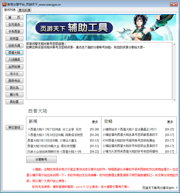 页游天下账号分享平台是一款优秀的页游账号分享获取平台,该软件能够帮助玩家获取热门页游游戏的账号,并且真实有效,每天都有近百个不同的高端游戏账号被玩家分享!