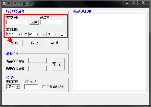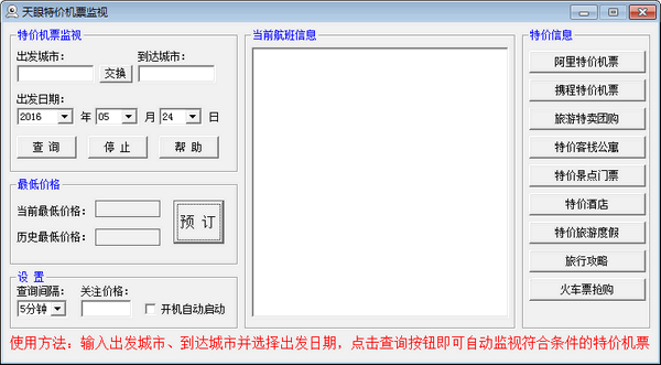 天眼特价机票监视工具是一款专门用于对特价打折机票的监视系统,出行旅游办公快舒适的交通工具就是坐飞机,但是飞机票一般都是不便宜的,为了能买到便宜的特价机票就可以使用这款软件进行监视机票行情。