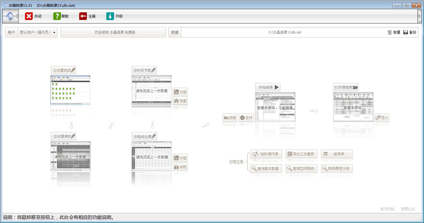 水晶排课是一款简单易用、界面美观的排课软件,能完美地导入Excel数据,并且能生成漂亮的Excel课程表,排课质量也非常优秀,基本告别所有手动和半自动排课方式,手动调课功能也非常强大。