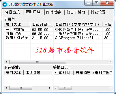 518超市播音软件是一款专门为大型超市进行语音播报的广播软件,该软件拥有拟真语言库,发音效果就如同真人播报。该软件还支持插入背景音乐、定时广播、随时插播的功能,同时支持手动设置优先级,让播音系统更智能。