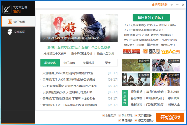 天刀百宝箱是一款经过腾讯授权的天涯明月刀游戏助手,拥有一键功能优化,内置自动答题器,挖宝方位提醒,一键曲谱演奏,捏脸数据等实用功能,内置资讯市场,你可以实时浏览每日新游戏信息,助你游戏更轻松!