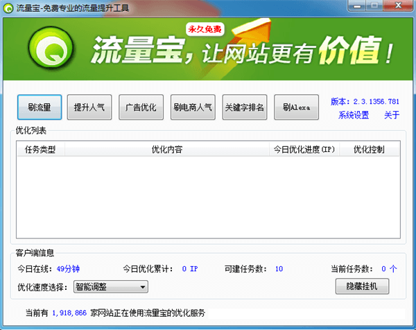 流量宝是一款专业提升网站流量和排名的软件,能快速提高网站的流量、排名还有人气,是现在网络营销人员的必备推广软件。