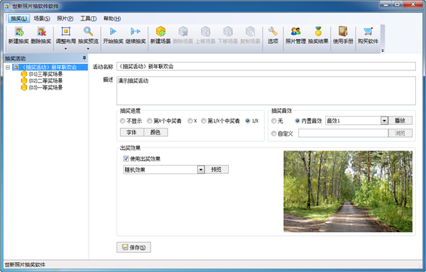 世新照片抽奖软件是一款功能强大的抽奖软件,适用于晚会、会议、婚礼、联欢庆典等各种场合。支持建立并管理多个抽奖活动,每个抽奖活动由一系列有顺序的场景组成,一个抽奖活动多可以包含99个场景, 每个场景拥有自己的照片组,标题,背景图片以及背景音乐。