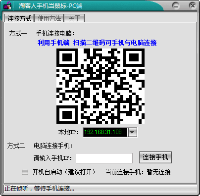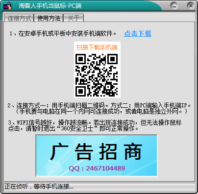 淘客人手机当鼠标是一款懒人必备的鼠标模拟软件,只需用手机扫描软件生成的二维码,即可轻松在手机上模拟电脑鼠标,包括移动、左右点击或双击,滚轮的操作等。还可以利用手机端对文本进行编写与发送,包括发送退格、回车等常用按键。