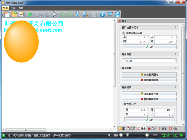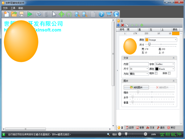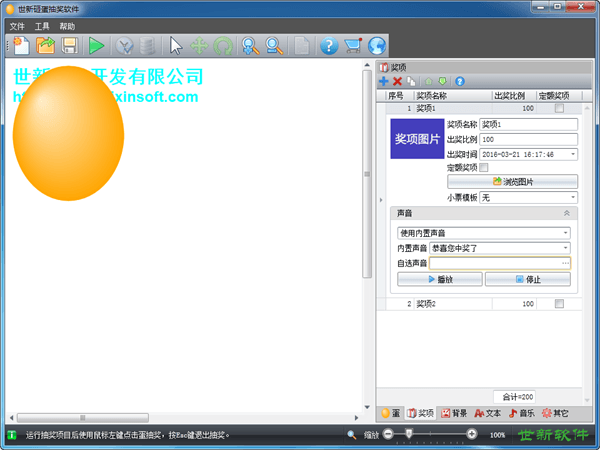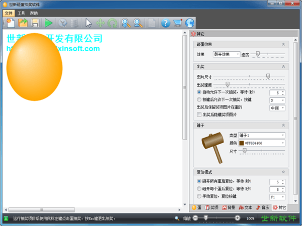 世新砸蛋抽奖软件是一款实用的抽奖软件,适用于商场、超市、联欢、促销活动、网吧等场合。支持多在抽奖界面上添加100个蛋,每个蛋的颜色和尺寸均可设置,每个蛋上还可以添加文字或者图片。抽奖时支持播放砸蛋音效、背景音乐和奖项出奖声音。