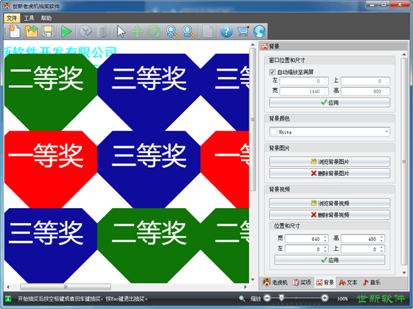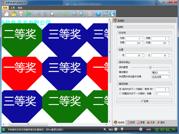 世新老虎机抽奖软件是一款适用于商场、超市、联欢、促销活动、网吧等场合的抽奖软件,可以模拟老虎机抽奖,创建3行或者1行、3列以上10列以下的老虎机网格,每个抽奖项目可以创建多达100个奖项,每个奖项可以设置一个奖项图片。