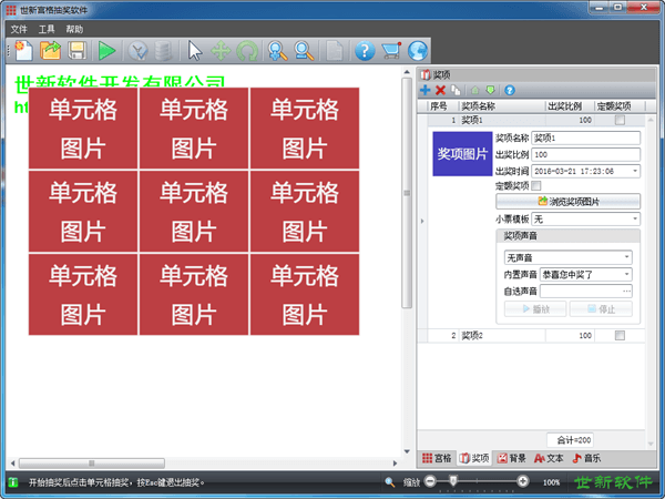 世新宫格抽奖软件是一款功能强大的抽奖软件,一般适用于商场、超市、网吧、促销活动等。用户可以根据需要设计抽奖宫格,并可以设置每个奖项的出奖比例。世新宫格抽奖软件支持创建多达32行32列的宫格,支持创建多达100个奖项。
