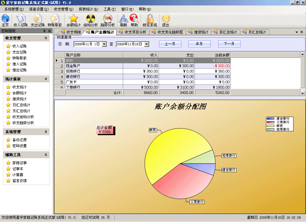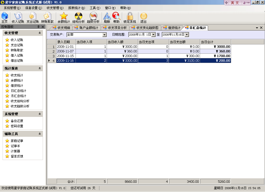 星宇家庭个人理财记账软件是一款非常好用的家庭账簿管理软件,运用它可以进行家庭收支,流水账目的管理,不仅调理清晰, 还可以自动备份,自动分析家庭收支情况,完成家庭日常生活收支管理工作,助您轼轻松实现家庭理财。