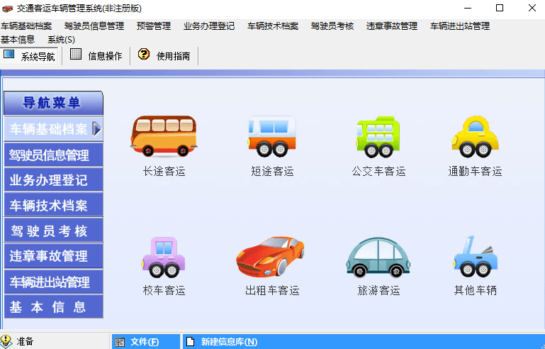 宏达交通客运管理系统是一个非常好用的交通客运管理工具,软件主界面有车辆基础档案、驾驶员信息管理、预警管理、业务办理登记、驾驶员考核等功能菜单,其中车辆管理类型包括长途汽车、短途客车、公交车客运、校车客运等。