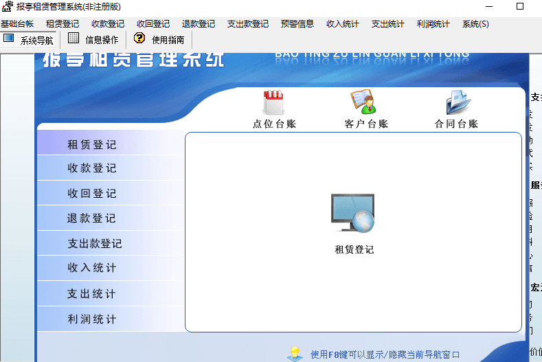 宏达报亭租赁管理系统是一款实用的租赁管理软件,软件主界面有基础台账、租赁登记、收款登记、收回登记、退款登记、支出款登记等菜单,功能十分丰富,涵盖了报亭租赁的一系列流程。软件操作简单,方便使用。