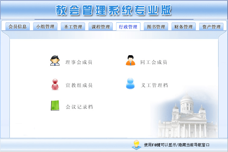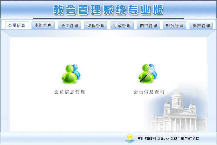 宏达教会管理系统是一款功能全面丰富的教会管理工具,界面简洁直观,包括会员信息、课程管理、圣工管理、图书管理、行政管理、财务管理以及资产管理等多个功能模块,能够帮助用户高效地、系统化的管理教会相关事务。