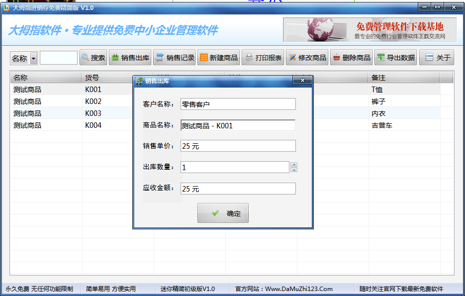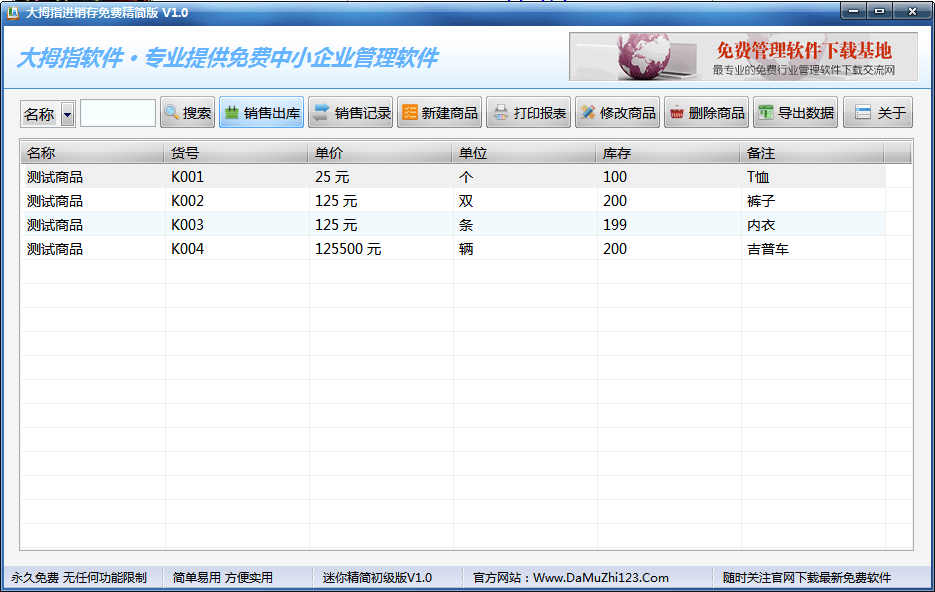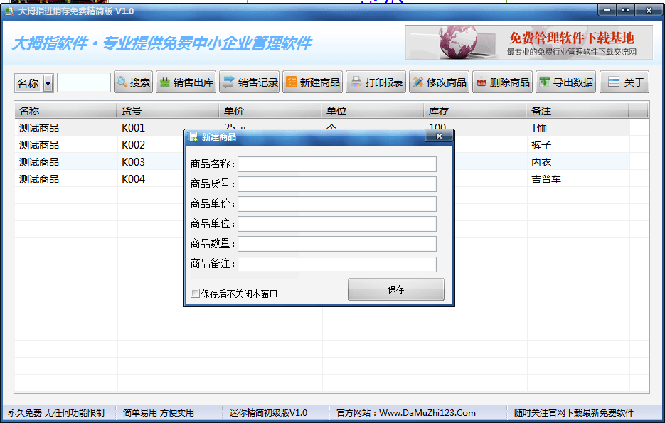 大拇指免费(原彩虹进销存)进销存版管理软件是一款傻瓜型永久免费的进销存精简版。其功能强大、操作简便、界面美观、程序精小,是管理服装销售、箱包鞋帽、商品销售管理等行业的好帮手。支持按商品品名和货号查找搜索商品、支持商品报表统计打印、支持查看每日销售记录和统计、支持商品数据资料Excel表格文件导出等。