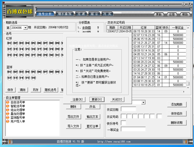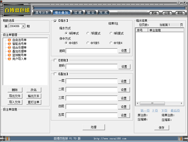 百博双色球是一款专业的双色球彩票分析软件。集选号、分析、胆拖、缩水、叠加、过滤、组合、对奖于一身。其主要功能是分析彩票开奖号码的走势和随机事件中的运行规律,分析各号码出现的频率及分布情况,运用多种分析手段进行彩票分析。