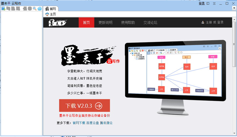 墨未干云写作是2016全新推出的一款写作神器。专为小说设计的故事树;完全自定义的元素类型;为你的想象力插上翅膀!软件支持多小说 多章节同时编辑;搜索定位既方便又快捷;不会因为太多文字晕头!