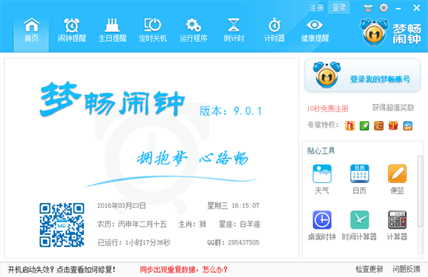 梦畅闹钟是一款多功能的电脑定时计划软件,集定时提醒、定时打开程序、定时关机、倒计时、时间计时、校对时间等于一体。软件小巧轻便,不占内存,平时可隐藏在后台运行。