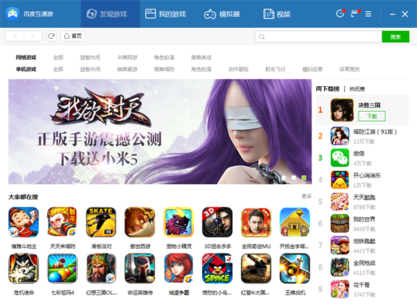 百度互通游是由百度手机助手推出的一款安卓手游模拟器,提供海量安卓游戏应用给玩家下载,安全无毒。软件内置天天、手游部落、bluestacks三大模拟器,可以运行超过80%的安卓应用。