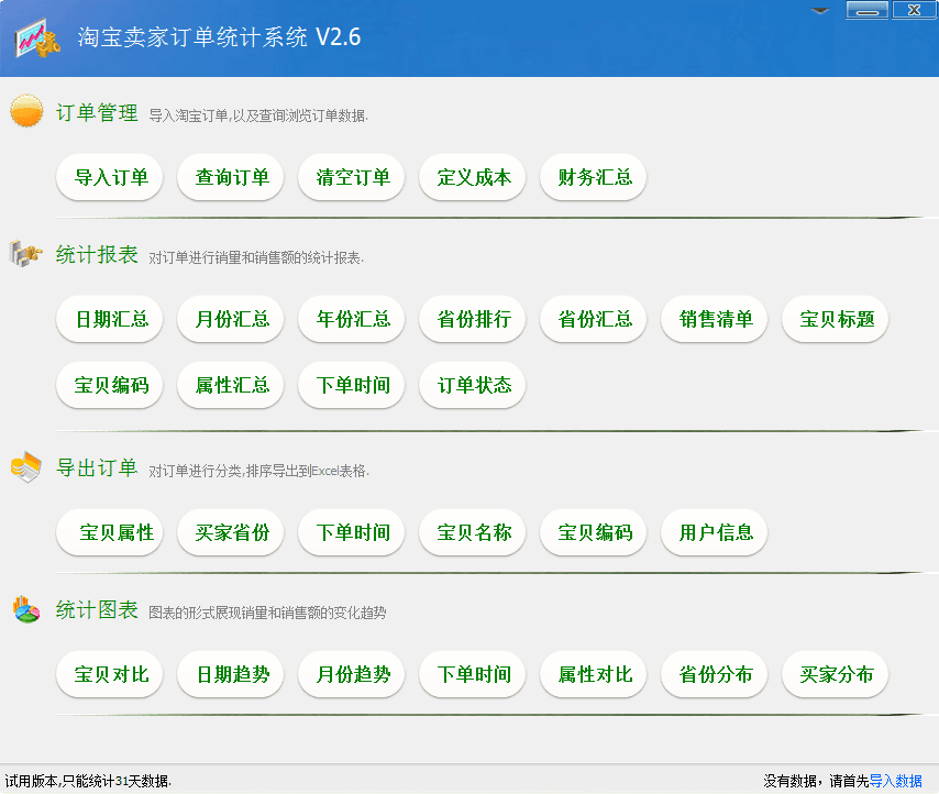 淘宝订单系统是一款可以帮助淘宝卖家对销售的订单进行一站式分析,统计,汇总,报表,数据的分类导出,订单数据的排序导出等的工具,可以按照每天,每月,指定的时间范围对 销售数据进行操作.帮助您制定合理的销售方案,为您分析销售中遇到的问题提供详尽的数据支持。