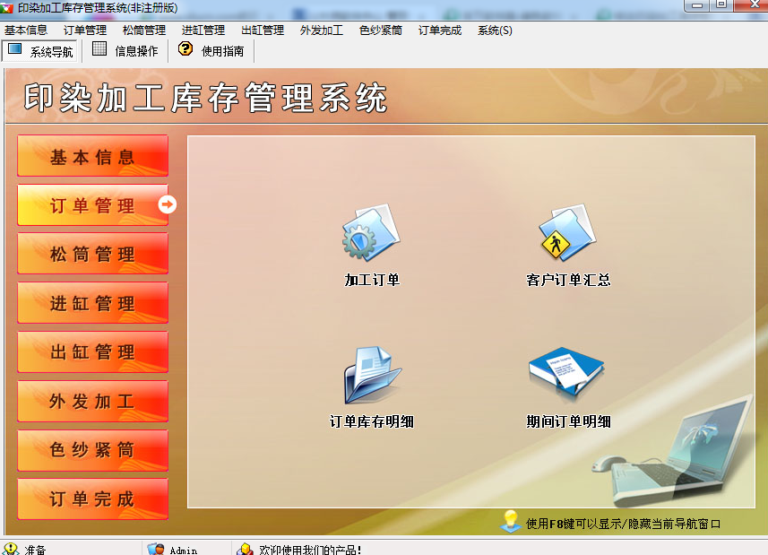 宏达印染加工库存管理系统是一个非常好用的管理软件,功能十分丰富,具有订单管理、松筒管理、进缸管理、出缸管理、外发加工等多项菜单,你可以轻松地进行地进行订单录入、订单查询等操作,操作十分方便。