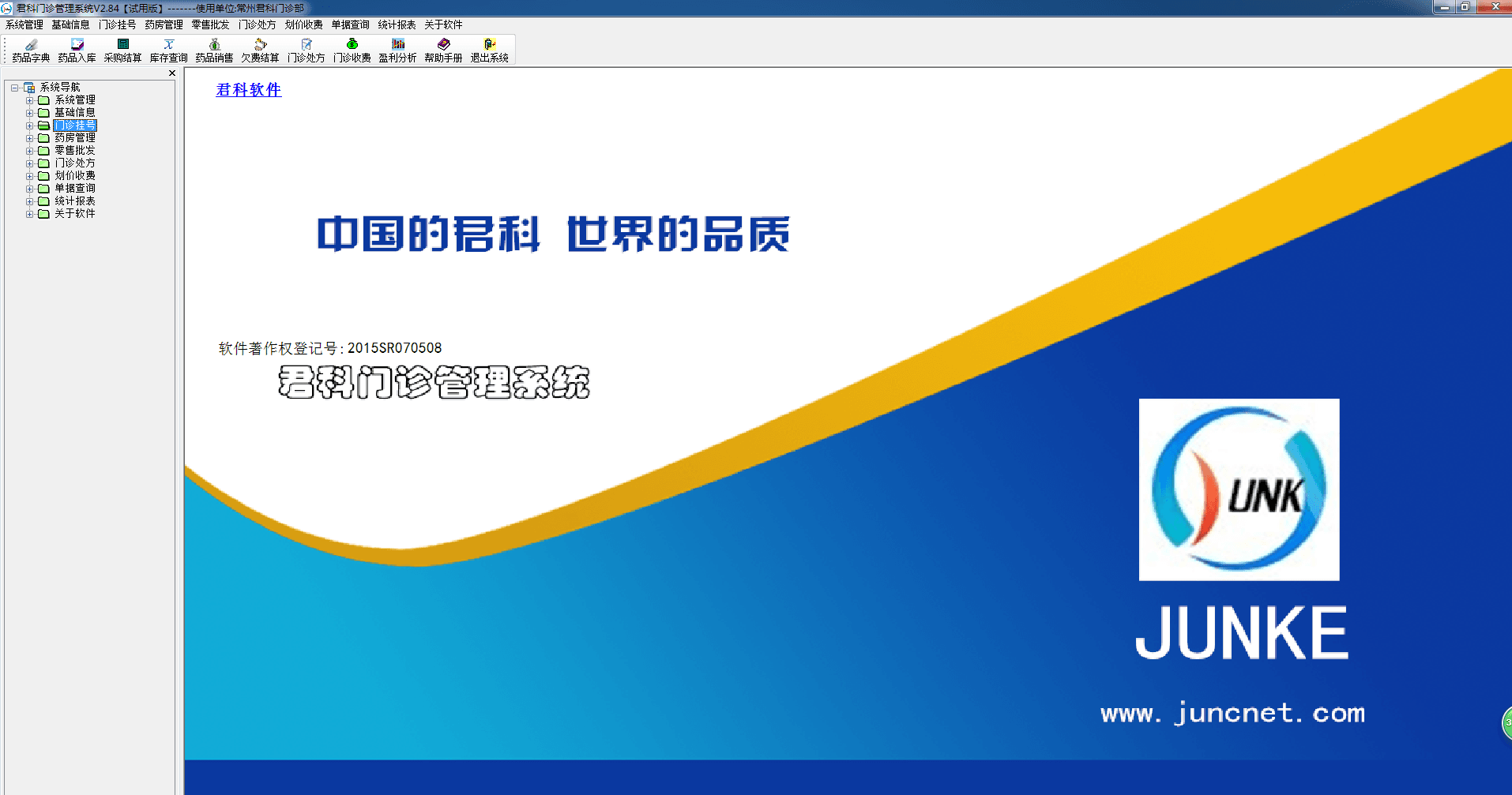 君科门诊管理系统是一套门诊的医疗管理软件。软件具有强大的用户权限管理机制,适用于门诊医院,小型医院的全面管理,也适用于大型医院的专项管理。软件支持病历处方、药品库存、门诊挂号、收费发药等办款的管理与查询。