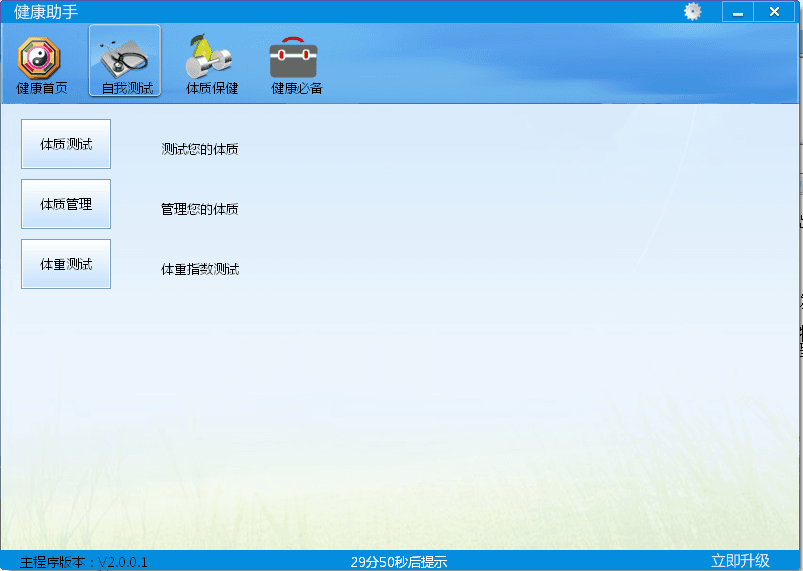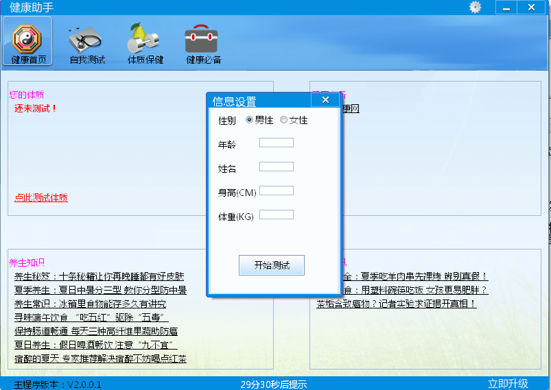 健康助手是一款专业身体检查检测软件,软件可以对人的身体进行综合性测试,会对测试的结果给出相应的评测,让你知道自己身体的哪个部位不太健康,帮助你打造健康的身体。