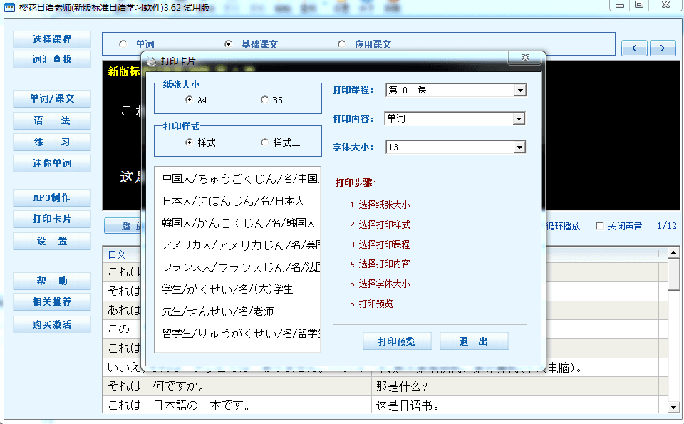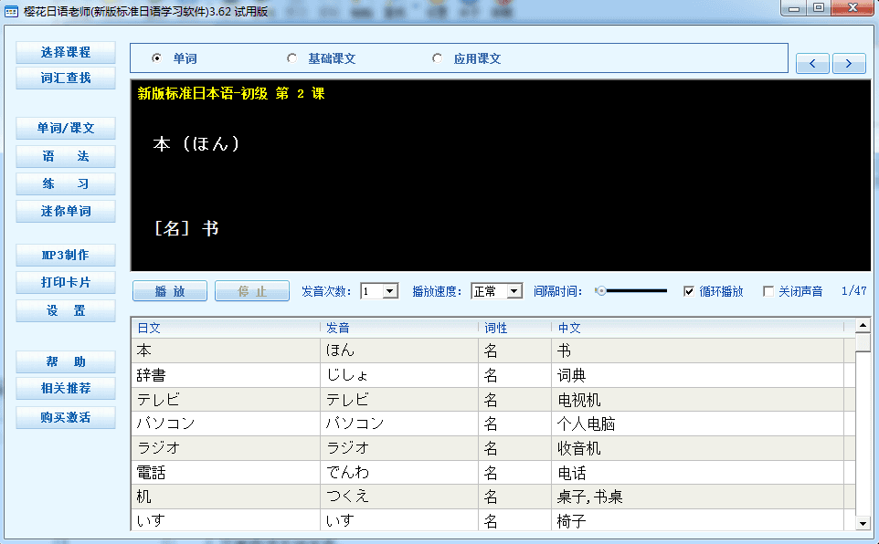 樱花日语学习软件是专业教导日语学习软件。樱花日语是针对初学者和自学者在学习过程中,词语记不牢,音调读不准,文章不会读,课下无人辅导等问题而开发的一款软件。通过这个软件你可以学习得更好、更快。