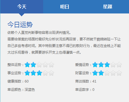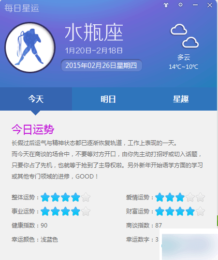 每日星运是一款能够为您在线查询今天和明天两日的星座运势的软件,在冥冥之中每个人的命运似乎与星座有着千丝万缕的联系,为了让你更加了解自己的运气走势是可以使用每日星运进行查询的。