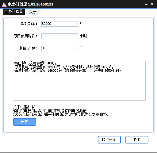 电费计算器是一款简单实用的电费计算工具,该软件小巧实用,用户输入消耗功率,每天使用的时长以及电费价格,就可轻松计算出每天、每月或每年的大概费用!