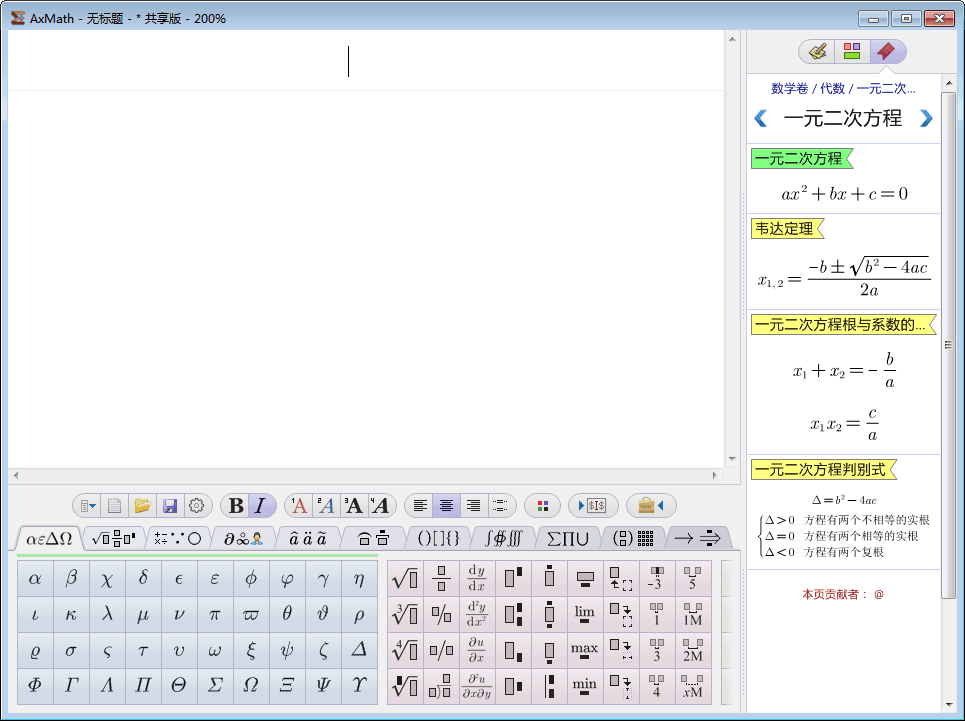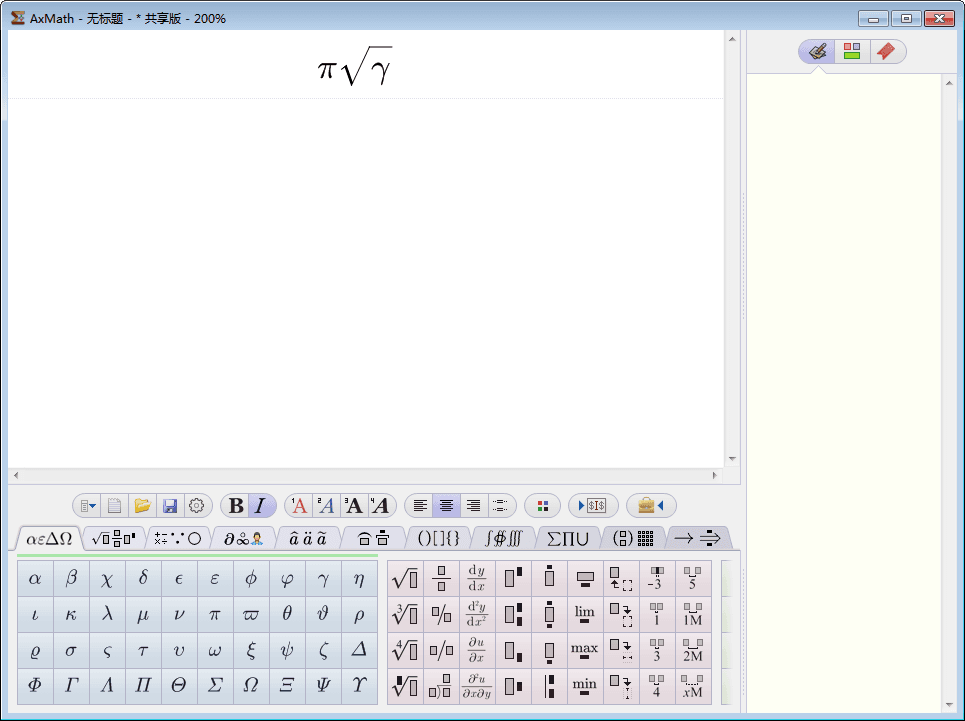 AxMath是一款优秀的公式编辑器与计算器,该软件功能强大,图形化的排版布局设定,排版更方便,滚动式工具栏,常用数学符号全部呈现,一次点取即可实现输入!