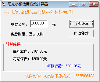 阳光小额信用贷款计算器是一款小巧实用的个人信用贷款计算器,只需要输入贷款金额,点击“立即计算”就可显示每期还款的金额,操作简单,非常实用!
