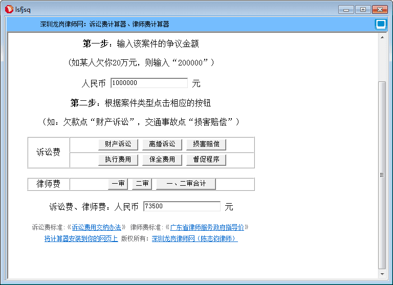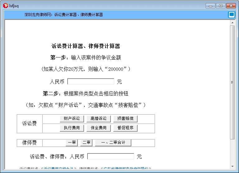 诉讼费律师费计算器是一款专门用于计算诉讼和律师费用的软件。诉讼费包括财产诉讼、离婚诉讼、损害赔偿、执行费用、保全费用、督促程序;诉讼费包括:财产诉讼、离婚诉讼、损害赔偿、执行费用、保全费用、督促程序。律师费包括:一审、二审、一、二审合计。
