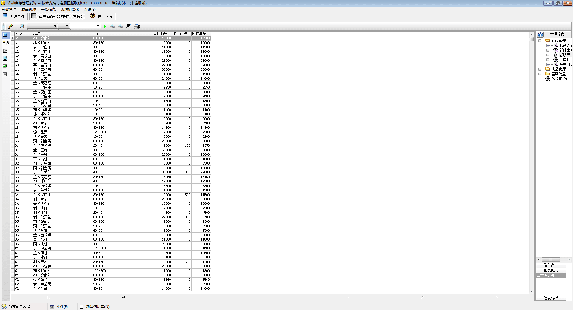 彩砂库存管理系统是专门为彩砂厂而做的一款库存软件,彩砂库存管理系统操作简易,库存统计功能强大,轻松管理好您的仓库货物,简单易用。