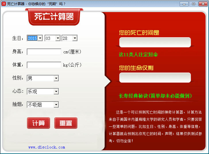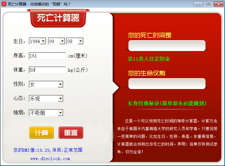死亡计算器是由美国科学家成功研制出的预测死亡时间的神奇计算器,只需输入生日、性别、身高体重等信息,就能预测出你的死亡时间,有胆就来看看您的“死期”是什么时候,死亡计算器在线预测,生命的长度是用时间来衡量的。