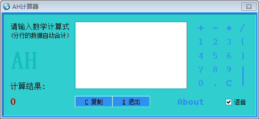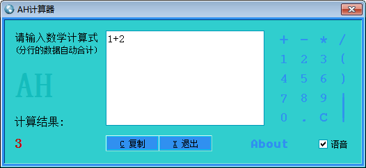 AH计算器是一款人人都适用的实用简便计算器软件,一款傻瓜型计算器软件,AH计算器软件也是一款表达式计算器软件,对Windows的计算器软件厌烦了吗,在寻找计算器软件下载吗,AH计算器软件会是你不错的选择。