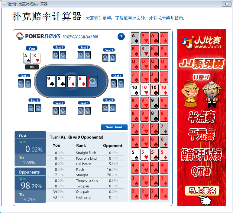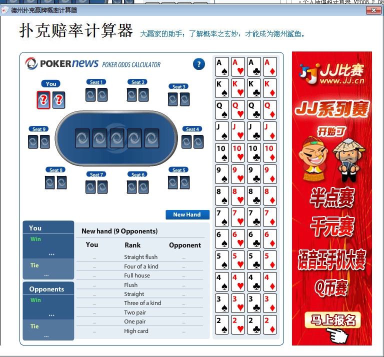 德州扑克赢牌概率计算器是一款德州扑克计算概率软件,德州扑克的好助手,模拟计算赢牌概率,非外挂!只要你方法对,赢的概率高达90%。