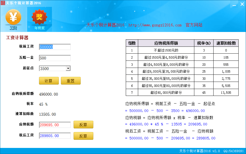 天乐个税计算器2016,可以将税前工资收入计算得出税后工资,以及所需缴纳的个税,还可以计算税后工资所得反推税前工资收入,软件界面有详细的个税税率表2016,以及对应的计算公式,非常实用且操作方便!